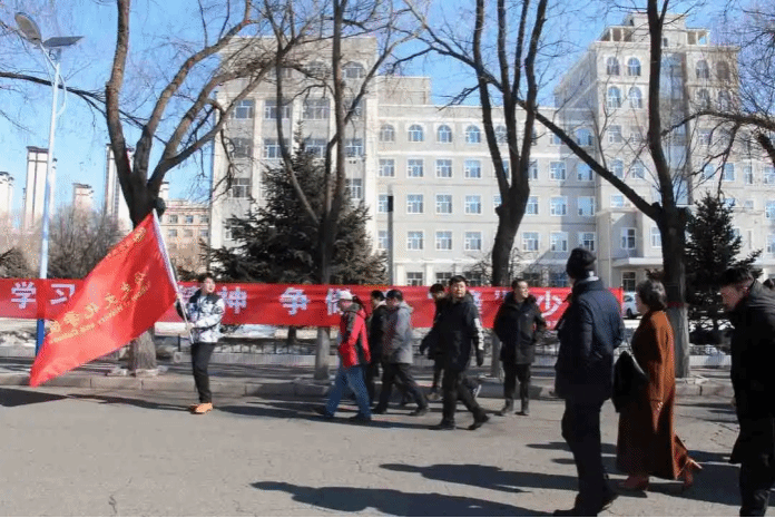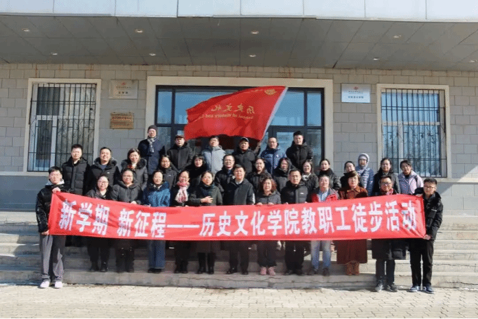 党委书记徐振岐发表讲话,宣布徒步活动开始。春气奋发,万物遽只。徒步队伍以人文楼为出发点,环校园徒步一周,最后回到人文楼前合影留念。