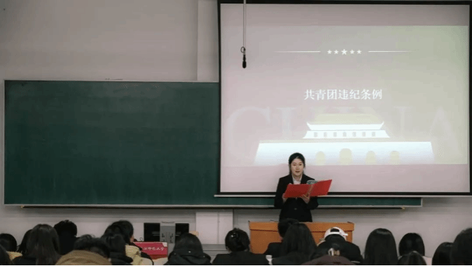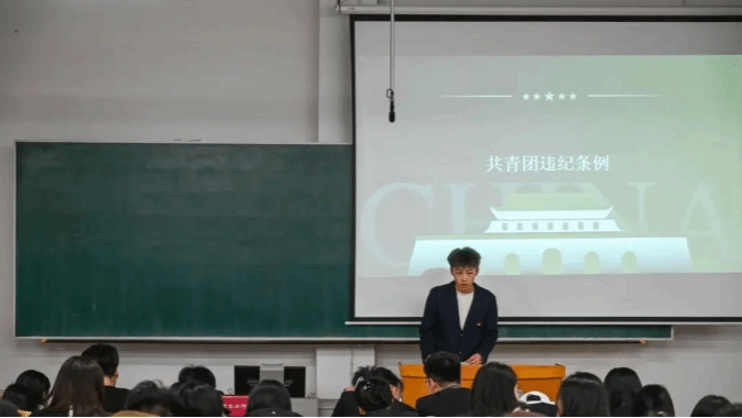 团务部部员樊瑞领学共青团中央于2025年1月1日施行的《中国共产主义青年团纪律处分条例》,引导全体团员遵规守纪,做合格的共青团员。