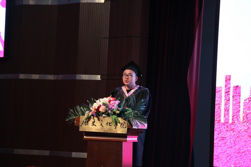 2014级本科生张泽栋代表全体毕业生表达对母校的深切依恋、对老师的由衷感激、以及对同窗的真心祝福。表示今后不论身在何方,一定会铭记自己是师大人,以山的坚毅和海的胸怀实现“敦品励学,弘毅致远”的宏大理想,祝愿母校与时俱进、蒸蒸日上、再铸辉煌。