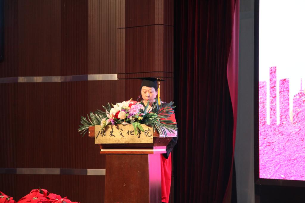 教师发表了热情洋溢的讲话。她肯定了毕业生四年来的努力,叮嘱毕业生要心怀感恩,志存高远;要脚踏实地,认真做事,谦虚做人;要不断培养自己的责任感,做对国家、对社会、对家庭负责的人。