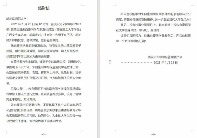 近日,哈尔滨师范大学收到一封来自西安火车站地区管理委员会的感谢信,信中感谢我校178足球