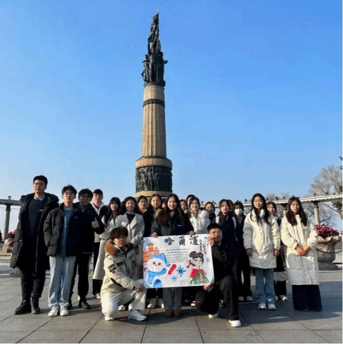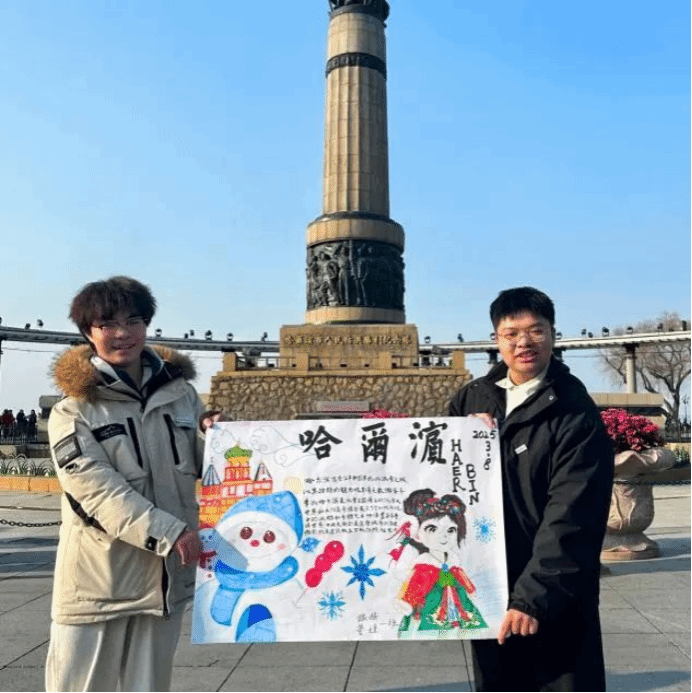 在防洪纪念塔前,马柯、李光炫向同学们展示了“情系魅力冰城”主题手抄报,激发同学们对冰城哈尔滨的喜爱之情,也提高了同学们将视觉表达与文化传播相结合的能力。