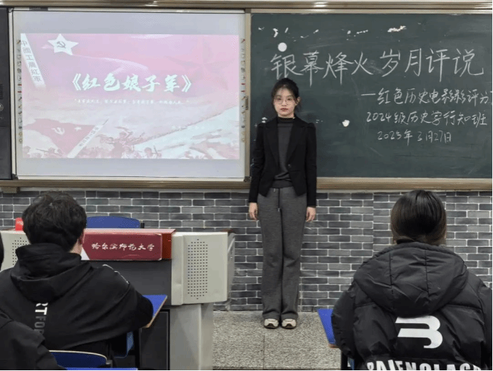 曲涵同学聚焦《红色娘子军》,讲述海南琼崖革命根据地女战士的英勇事迹。她结合电影与历史资料,强调“红色娘子军”不仅是艺术经典,更是中国革命女性坚韧精神的象征。影片中“向前进,向前进”的旋律,至今仍回荡着对自由与平等的追求。