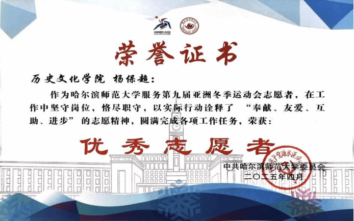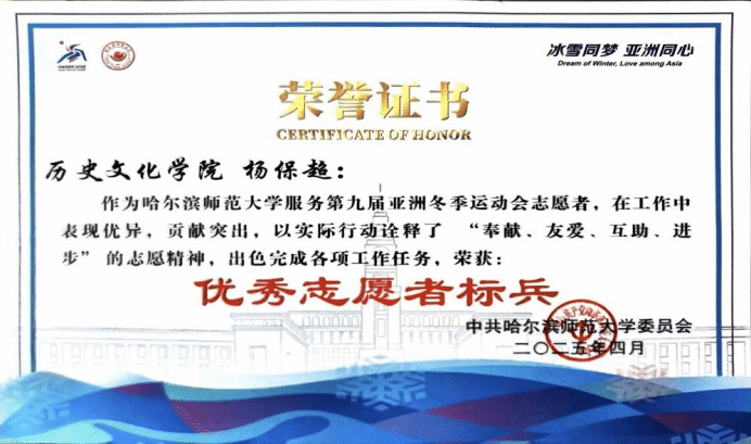 、学校,从校内延伸到校外,发挥着重要作用。令人骄傲的是,全体支部成员志愿服务参与率达100%,累计志愿服务时长高达1388小时。其中,“语你同行” 线上汉语智能平台成功入选团中央2024年“推普助力乡村振兴”全国大学生暑期社会实践服务活动,成为全校唯一获此殊荣的项目。此外,团支部成员在挑战杯中荣获省级铜奖,在城市讲解大赛中获得三等奖,还有3名同学成为亚冬会志愿者,每一项成果都闪耀着青年的责任担当与奉献精神。