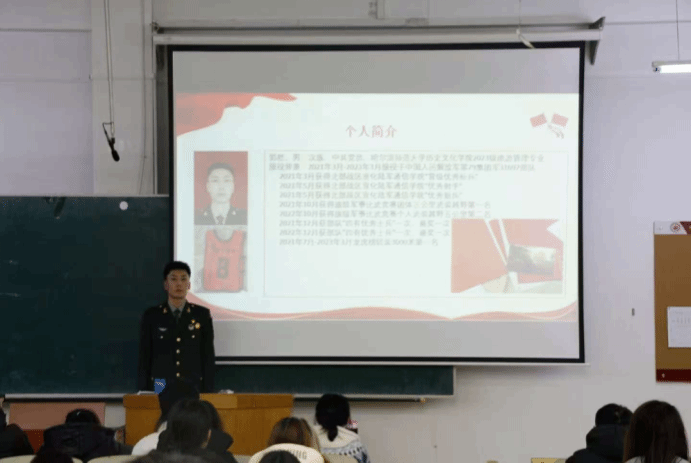 本次活动由178足球直播网官网 2023级退役军人郭胜同学讲解。他从国家战略与国防建设的高度,阐述了参军入伍的重要意义。结合自身经历,郭胜通过丰富的图片、视频资料,生动展示了真实的军旅生活和部队锤炼,使同学们对严谨的纪律、团结的氛围和充满挑战的训练有了直观了解。随后,他系统解读了征兵报名的具体流程、时间节点,并详细介绍了学费补偿、升学优惠等关键政策,为同学们提供了清晰、全面的指导。