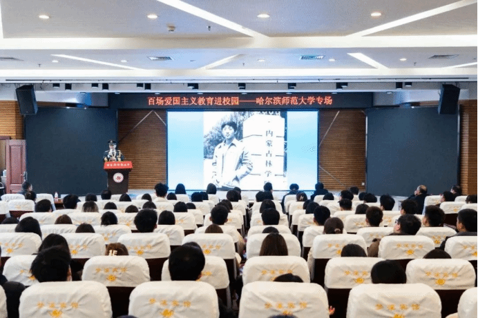 2025年是中国人民抗日战争暨世界反法西斯战争胜利80周年,为进一步加强爱国主义教育,铭记历史,缅怀英烈,4月2日,由民盟黑龙江省委会和民盟北京市委会共同主办的“百场爱国主义教育进校园——哈尔滨师范大学专场”活动在我校举行。民盟黑龙江省委会专职副主委白成君出席活动并致辞;原陆军某部主任、陆军战略战役训练专家、陆军军事理论专家、对越自卫反击战一等功获得者胡国桥大校作专题报告;校党委副书记、工会主席郭砾,党委副书记王辉,党委常委、宣传部(党委教师工作部)部长张艳君,党委宣传部、党委统战部全体成员,民盟哈师大委员会部分盟员代表,以及300余名学生代表参加活动。活动由郭砾主持。