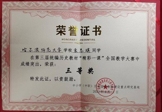 417日,第三届统编历史教材“精彩一课”全国教学大赛在福建师范大学落下帷幕,我校178足球 2020级历史学专业袁思琪同学在段永富、王耘、吴玲老师的指导下获得大赛三等奖。