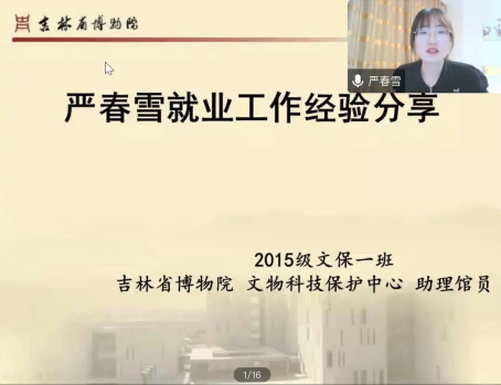 文物保护技术专业举办的优秀毕业生求职经历分享会以线上形式顺利举行。会议邀请了九位文物保护技术专业优秀毕业生,分别从工作及求学等不同方向为在校同学们指点迷津,帮助大家更好地确定职业目标。文物保护技术教研室全体教师和全体学生参加了分享会。会议由苗畅老师主持。