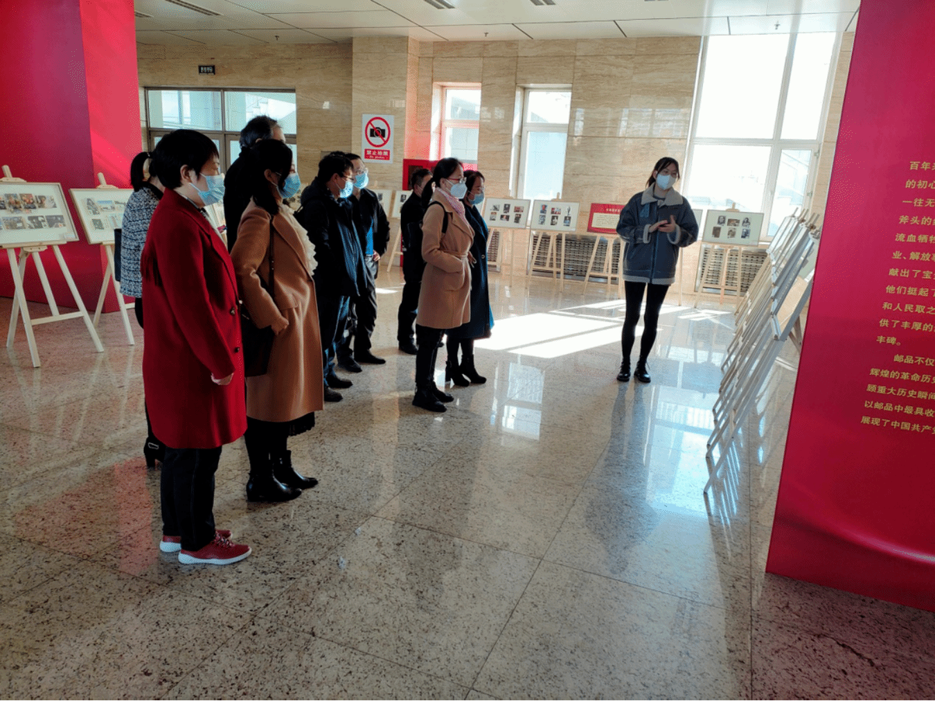在讲解员的带领下,大家仔细观展,认真聆听“中国共产党的创立”“共和国的缔造者”“人民军队的创建者”“双百人物”“百年辉煌历程”五大板块内容,不时交流思想,了解极限片背后的故事,感悟党的初心和使命。
