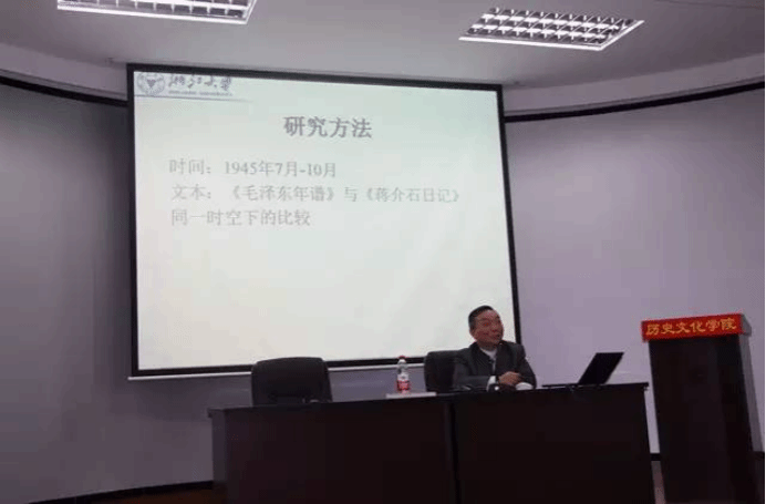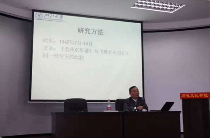在报告中,陈老师通过解读《毛泽东年谱》、《蒋介石日记》等重要史料,分析评判毛泽东和蒋介石在1945年7月至10月间对抗战胜利的判断、态度及政治反映等,同时对国共两党在对日政策、国内形势以及国民党最终失败的原因等方面进行了深度解读。在报告中,陈老师严谨的逻辑分析、精炼幽默的学术话语、深厚的史学功底引起了与会师生的共鸣。报告在一片轻松愉快的氛围中圆满结束。